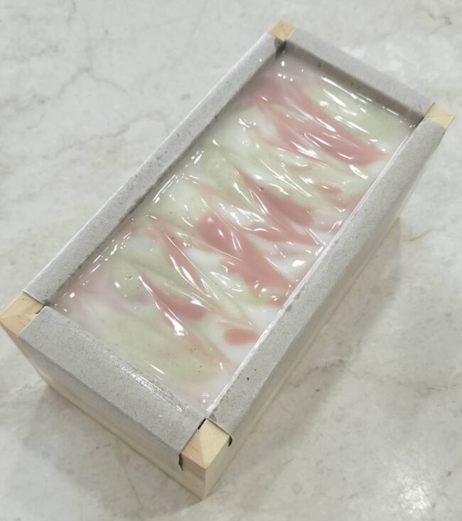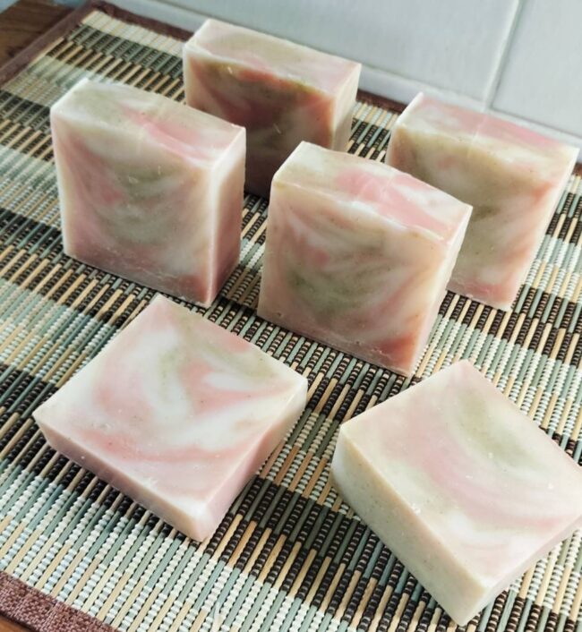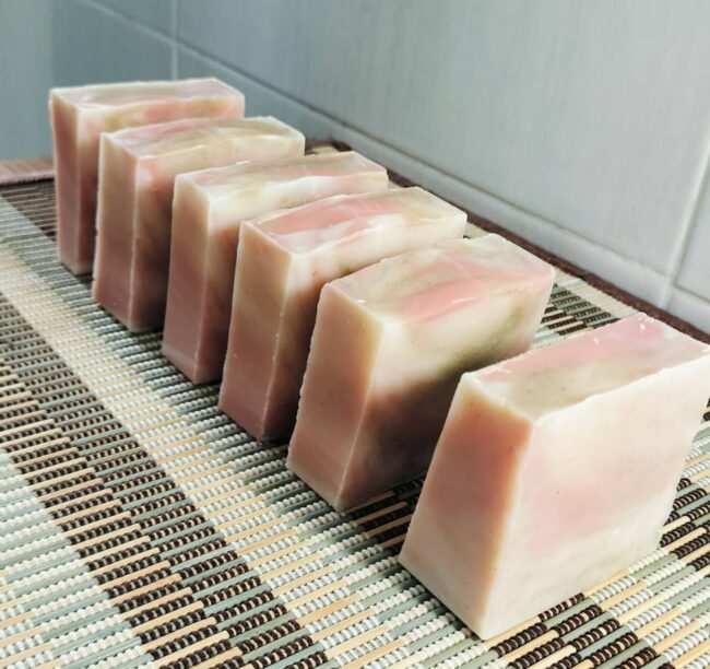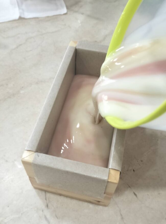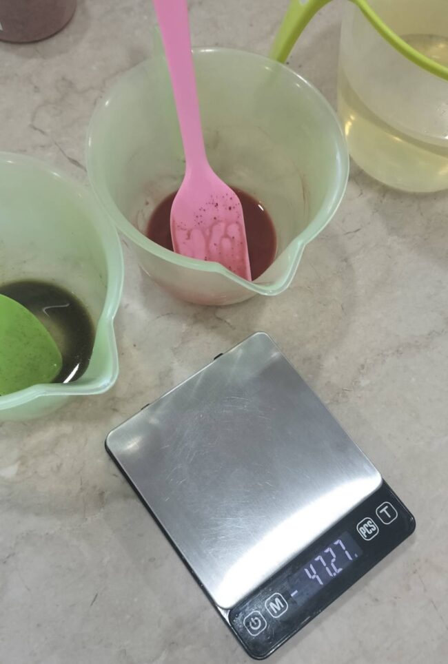 石鹸に柄を入れるために、モリンガ色とピンククレイ色を作っていきます。
